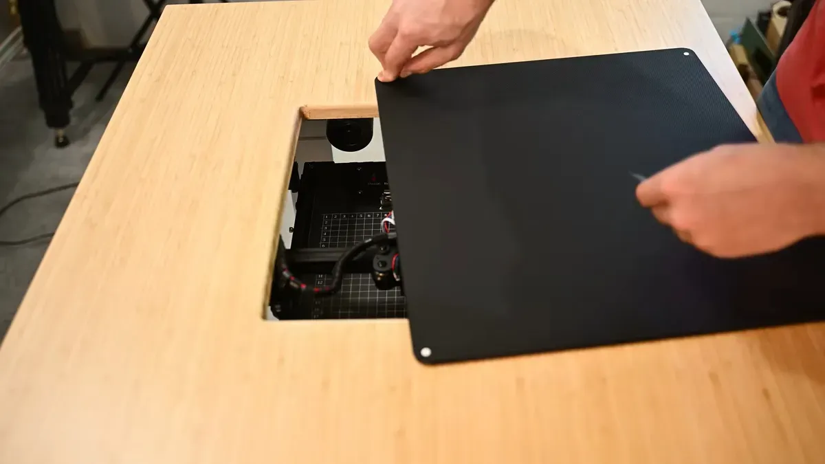 Железо спрятано под столом: механизм от графического планшета, вырез под стеклянный коврик и несколько напечатанных деталей. Управление простое — получил цель, сдвинул коврик, выстрелил.