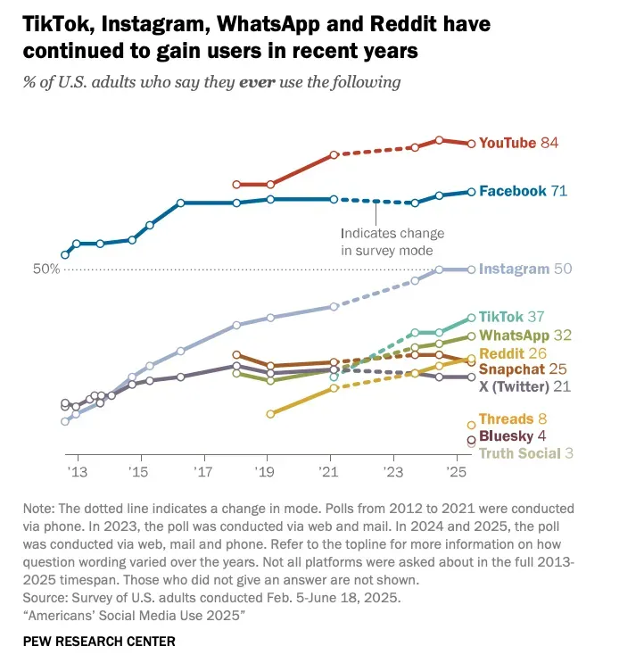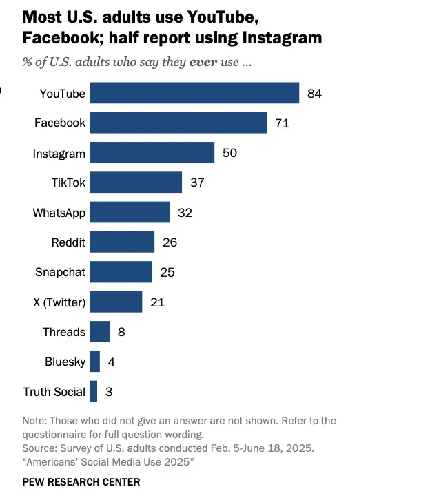 Единственный, кто обгоняет Facebook* по охвату, — YouTube. Им пользуются 84% взрослых, и почти половина заходит каждый день. И что особенно важно: только эти две платформы одинаково популярны у всех возрастов — от подростков до пенсионеров. В мире, где соцсети всё сильнее делятся по поколениям, это уже редкость.