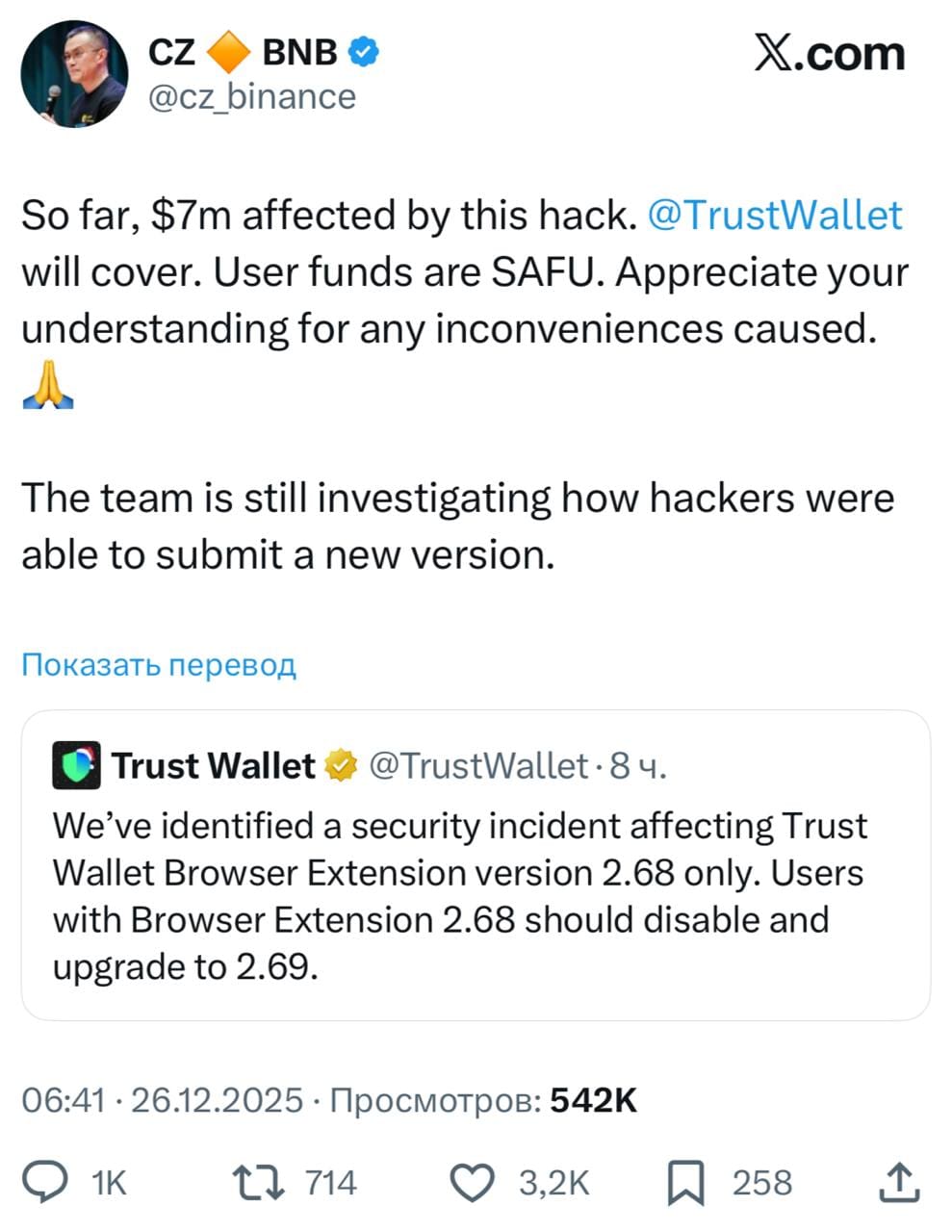 Команда Trust Wallter признала проблему и призвала пользователей срочно обновиться до версии 2.69. Мобильные приложения и другие браузерные расширения не пострадали. Чанпэн Чжао, сооснователь Binance, которой принадлежит сервис, пообещал вернуть деньги жертвам.